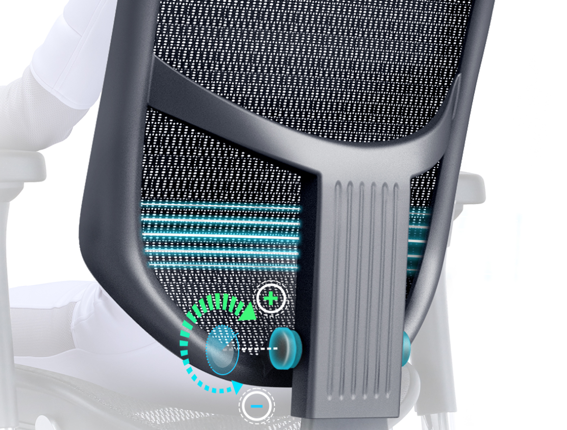 Le fauteuil Enjoy est doté d’un système lombaire unique qui, contrairement aux fauteuils traditionnels, offre une couverture lombaire complète et un soutien inégalé dans toutes les positions d’inclinaison. Ceci favorise une posture plus naturelle et aide à réduire les complications musculo-squelettiques. Une molette de réglage dans le dossier permet de durcir ou d'affiner la résistance du soutien lombaire.